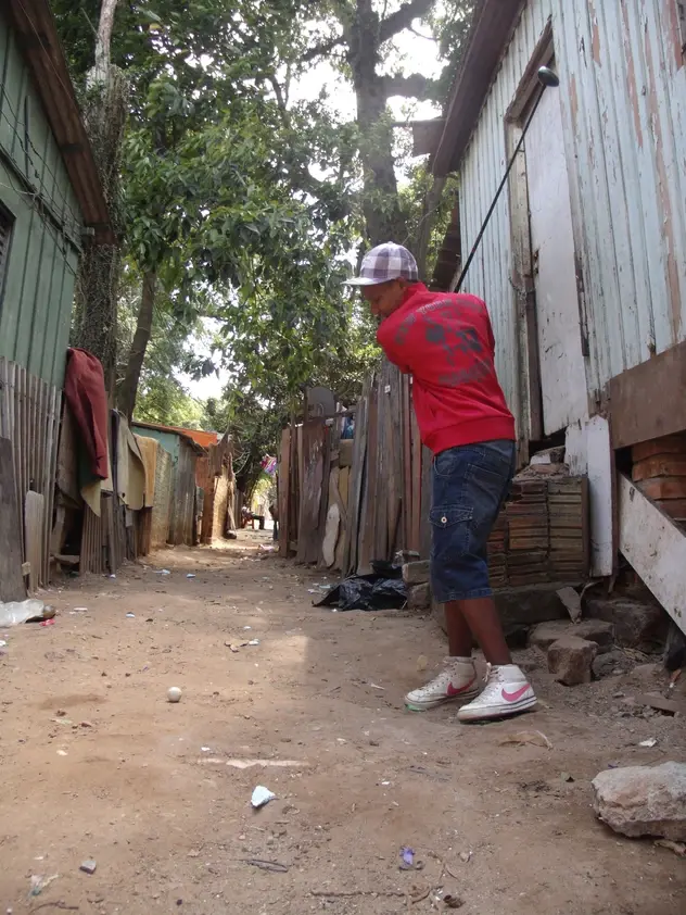 Bem no meio do muro que separa a vila da área ao lado, um pequeno buraco nos permite enxergar um terreno irregular, repleto de pedras e mais uma quantidade impressionante de lixo. O grande lote pedregoso e esburacado em nada lembra o tapete do Country Club, mas parece ser o suficiente para a prática do esporte. Os moradores mais antigos já deixaram de lado o terreno pouco apropriado para o jogo. A experiência os fez temer as lesões. Nunca se sabe quando o taco pode acertar uma pedra no meio do campo. Alheios a isso e visivelmente apaixonados pelo esporte, crianças e jovens, de 5 a 16 anos, pulam o muro diariamente para dar suas tacadas. Alen “Pitbull” nos mostra sua habilidade. Era inevitável que, mesmo na vila do golfe, o futebol se mostrasse presente. Com o taco, Alen faz infinitas embaixadinhas sem que a pequena bola caia. Os outros garotos também demonstram saber o truque. Mais que isso, Bruno explica a diferença entre os diversos tacos que cada um dos meninos empunha: o driver para tacadas iniciais, fortes e longas; o iron para apenas rolar a bola em um tiro próximo ao buraco. Bruno calça as luvas, crava o tee na grama, segura o taco tal qual um profissional e, em um swing quase perfeito, gira sobre seus pés que vestem Havaianas, jogando a bolinha a perder de vista. O pequeno objeto sobrevoa valas cheias de água camufladas pela vegetação e encobre os cavalos pangarés que pastam após a manhã de trabalho. A bola para a poucos metros de um pedaço de pau com uma toalha vermelha pendurada, que simula a bandeirinha e indica que o buraco está próximo. Em fila indiana, os garotos repetem o movimento. Desta vez, as tacadas são curtas, dentro de um green (a área próxima ao buraco) imaginário. O campo irregular exige conhecimento. Só quem já passou por lá sabe das caídas do gramado e dos efeitos que a bolinha pode pegar até cair no buraco escavado.